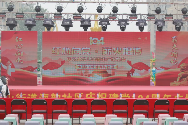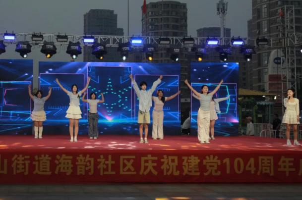近日,艺术设计学院志愿服务队“半扇青山”和“舞韵绮丽”社团走进大孤山街道海韵社区,参加“红心向党·薪火相传”庆祝建党104周年广场晚会,在文艺演出与公益宣传活动中用青春力量传递温暖,以专业所长服务社区。