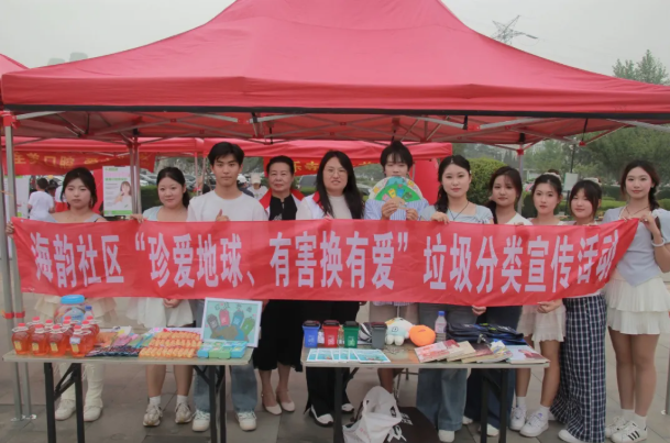演出结束后,志愿服务队与海韵社区联合开展 “珍爱地球、有害换有爱” 公益宣传活动。队员们向居民详细讲解垃圾分类知识,介绍废电池、过期药品等有害垃圾的正确处理方式,引导大家树立环保意识。